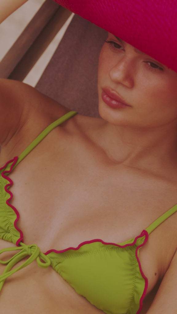 A bold and flirty triangle top with a bow tie closure in the center and a ruffled hem detail. It’s bright green with fuchsia piping for vibrant contrast. The green tie-closure bottom has one fuchsia hoop on each side, adding a pop of color and style.